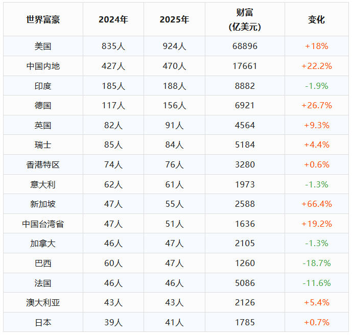 從財富的保有量來看更為驚人,2025年美國富豪們的總財富量為68,896萬億美元,把榜單中的另外14個國家加在一起都沒趕上!