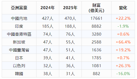 2025年,亞太區億萬富豪財富增長11.1%至4.2萬億美元,其中中國內地保持領先地位(1.8萬億美元)。