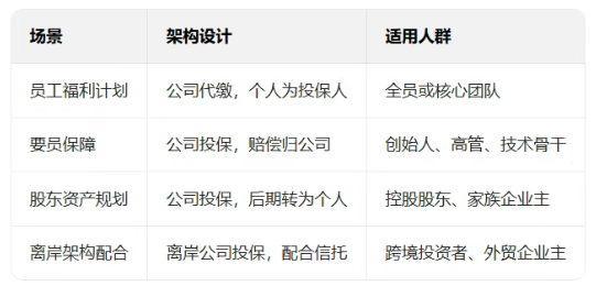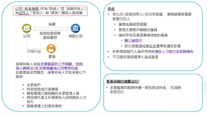 常見於“要員保單”,保障核心人員人身風險,賠付金歸屬公司。